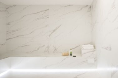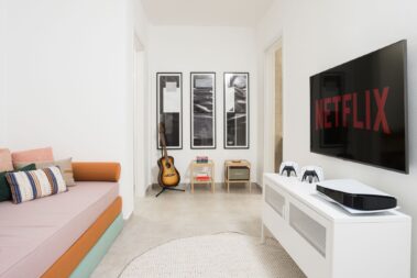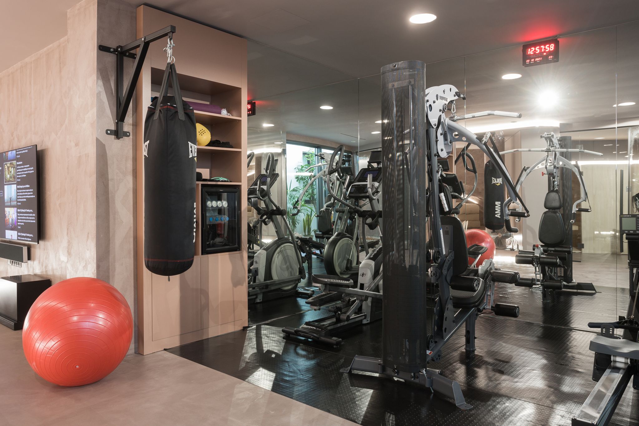 A two-floor apartment which has at the ground floor the living area, the dining area, the full equipped kitchen and a WC, while the spa area, the gym and the cinema room are located in the basement.