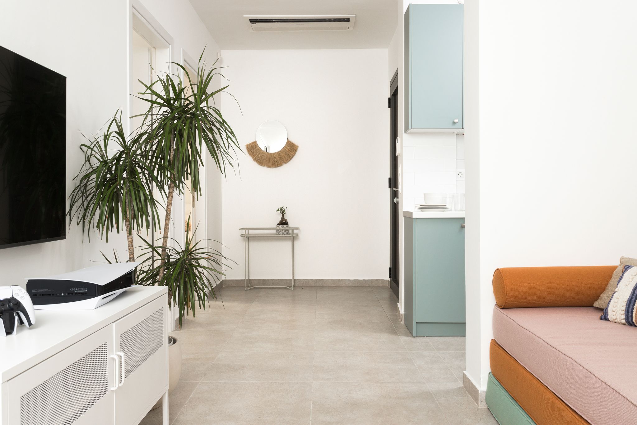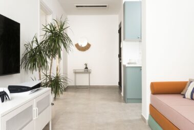 - The 10 meters long length open glass doors which cover the view of the Toroneos Gulf and the main purpose is that during his entrance, the visitor will concentrate his eye-sight on the horizon and the sea view.