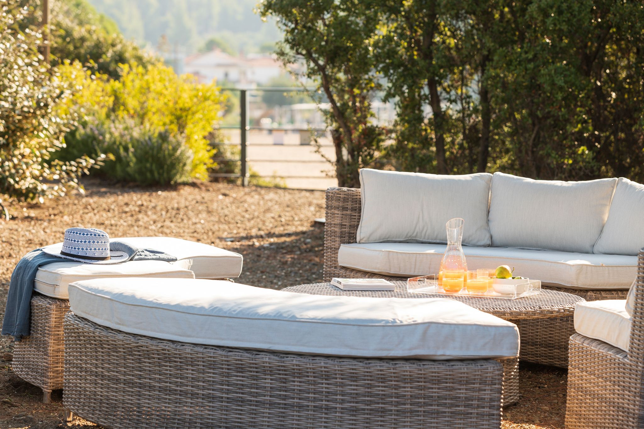 - The outdoor lounge area with fireplace.